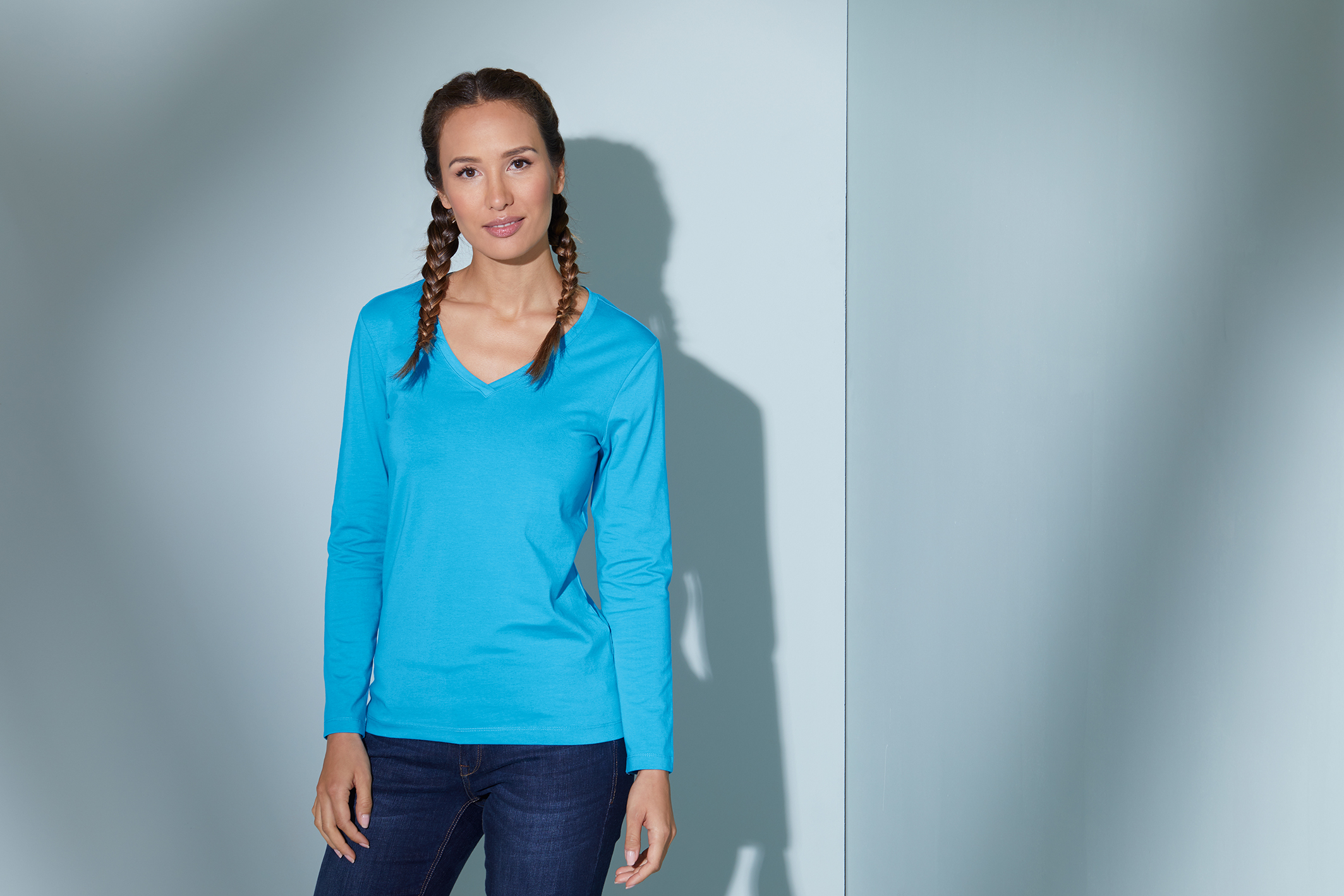 Dieses Modell zaubert mit seinem spitz zulaufenden V-Ausschnitt ein tolles Dekolleté, die schmalen elastischen Bündchen setzen auch einen Schal toll in Szene.