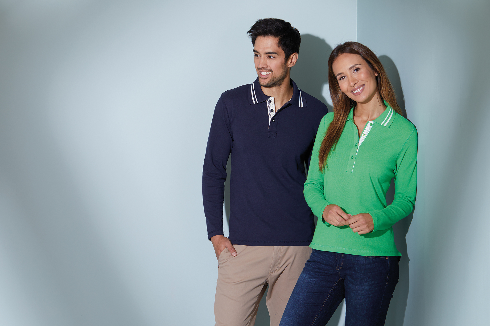 Dieses hochwertige Freizeitpolo mit langen Ärmeln passt durchaus auch ins Büro, denn der detailreich gestaltete Kragen ist eine sportliche Alternative zur Bluse. Die schöne Nackenlösung mit Halbmond aus Webstoff unterstreicht die hochwertige Verarbeitung zusätzlich.