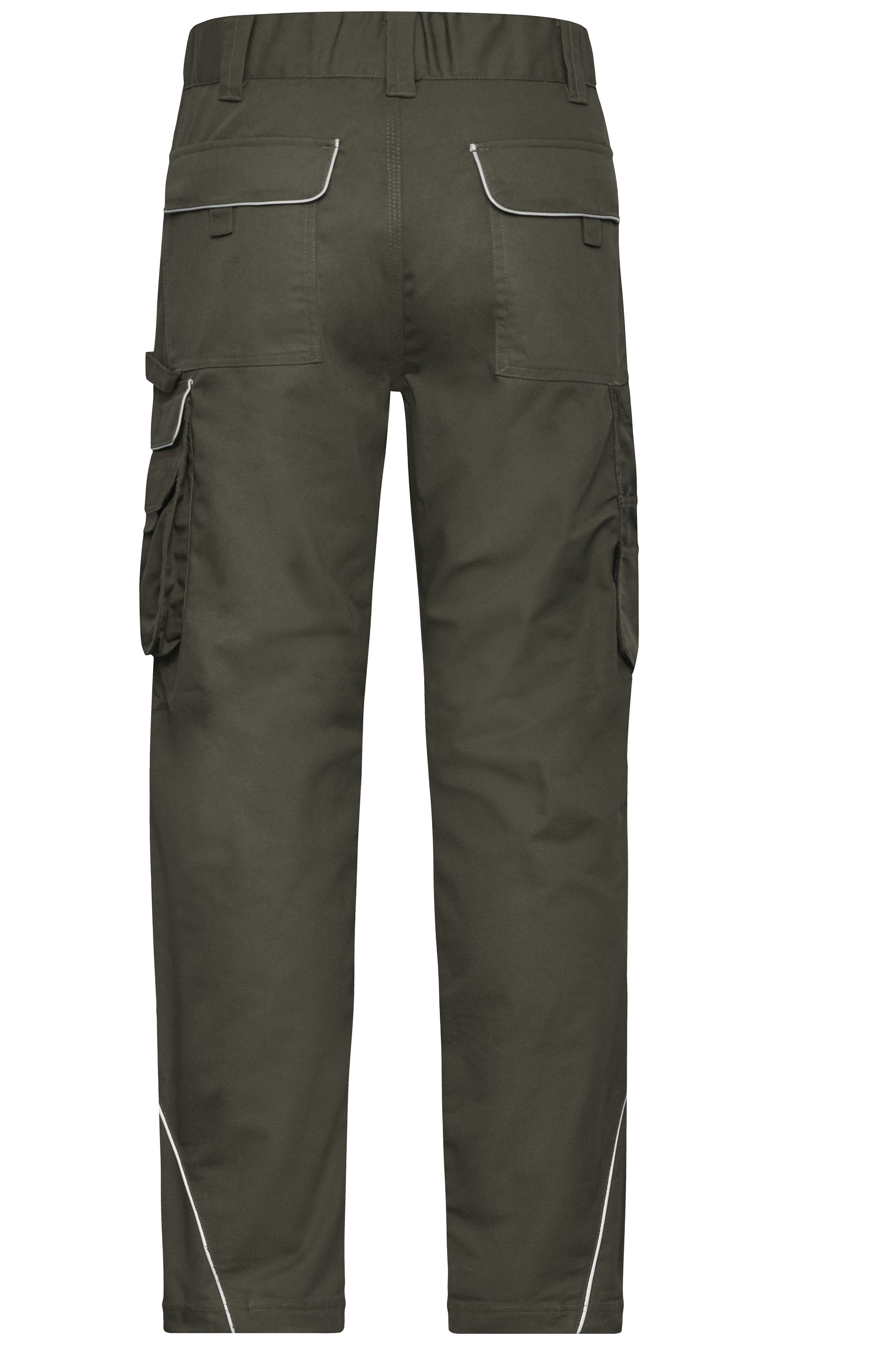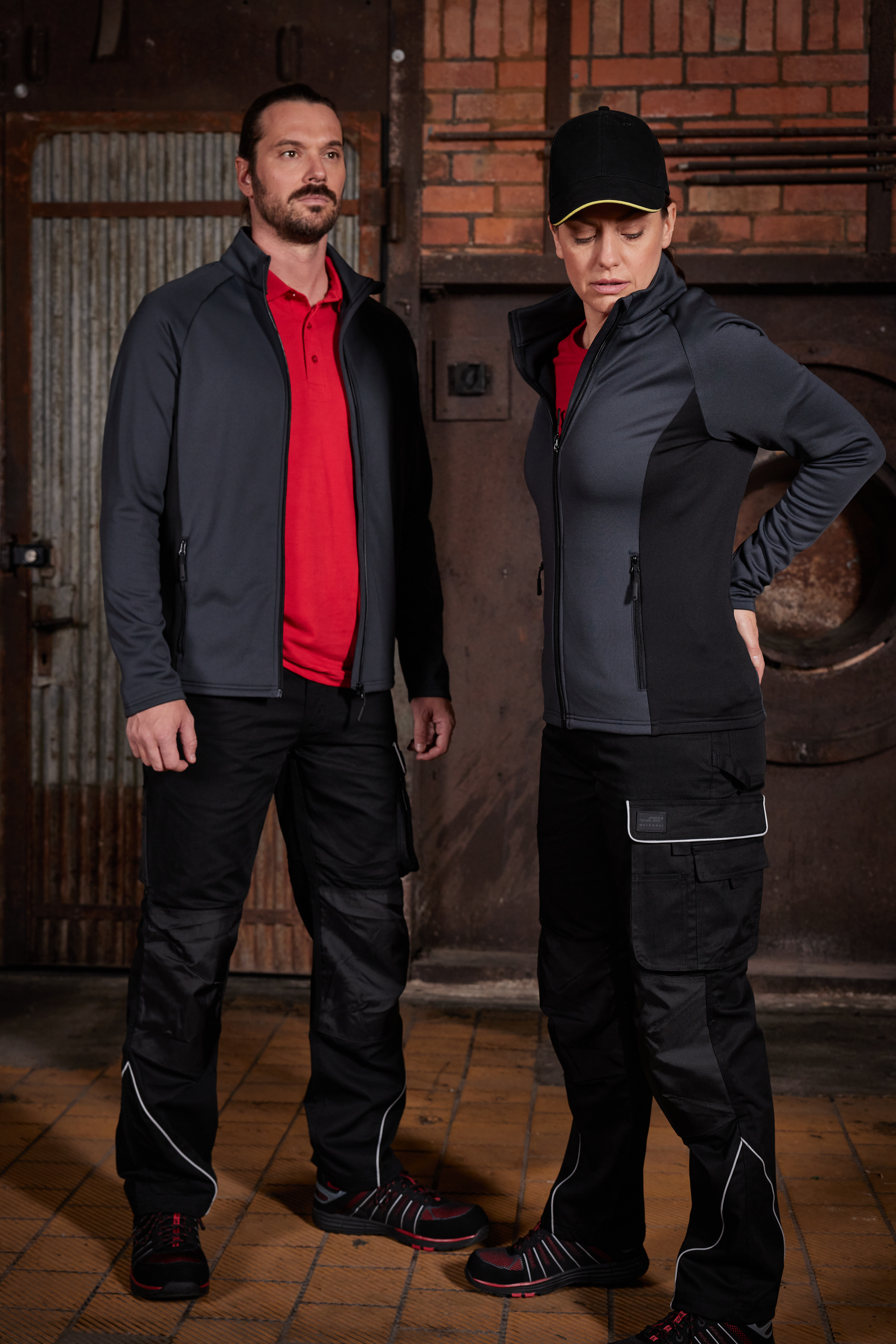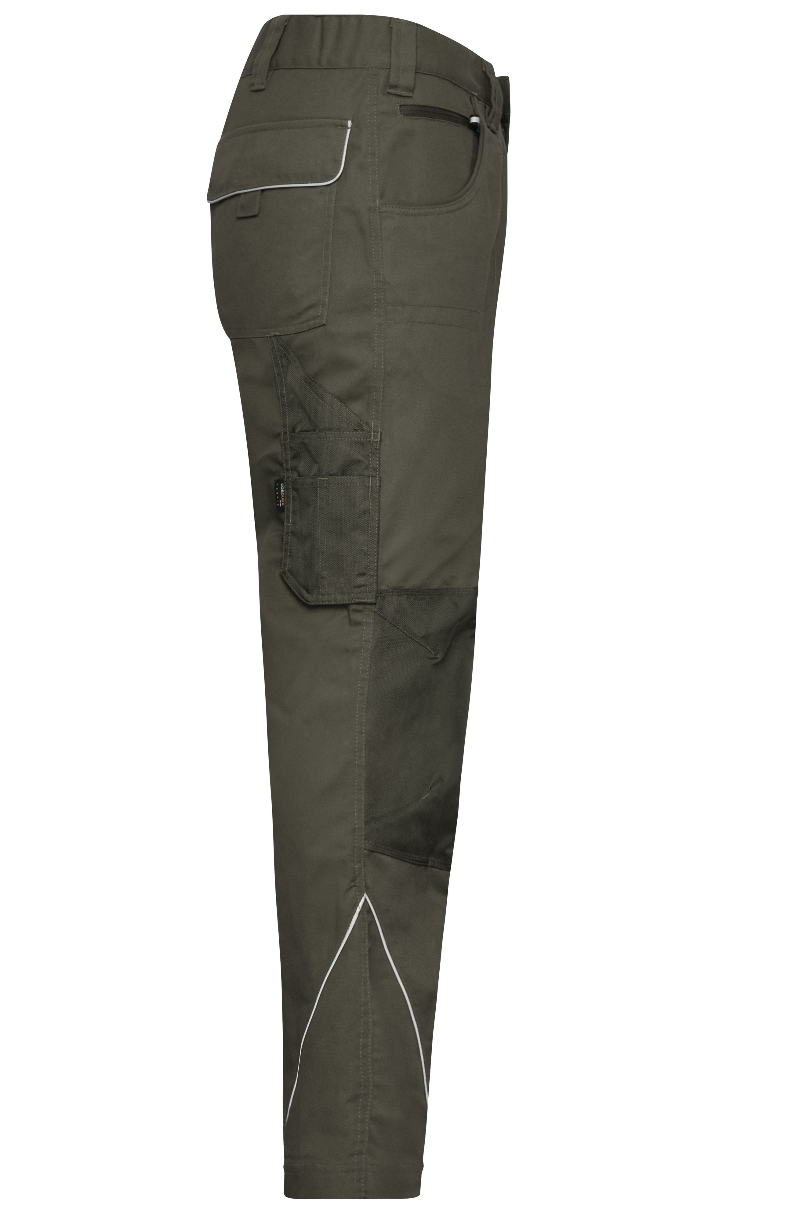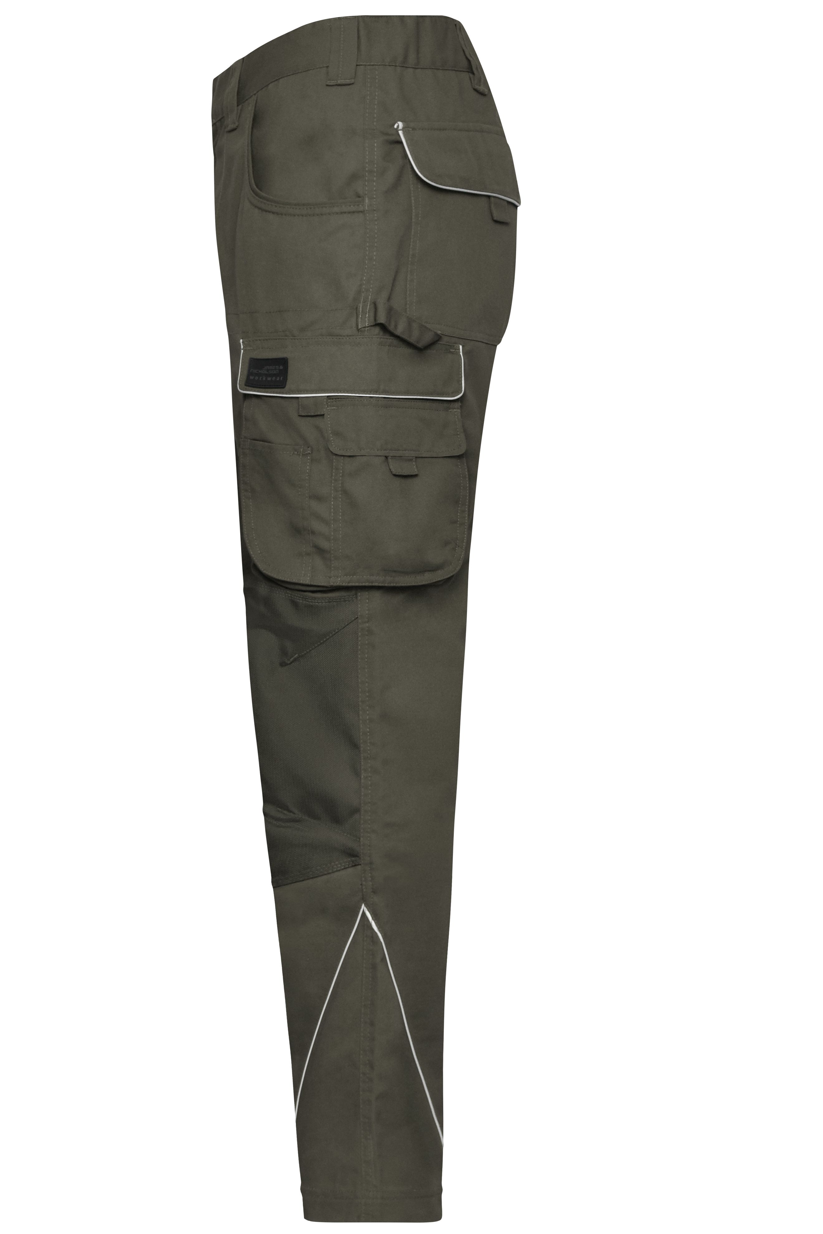 Das Mischgewebe aus Baumwolle und Polyester sorgt für angenehmen Tragekomfort bei gleichzeitig hoher Strapazierfähigkeit, es ist bei 60°C waschbar und trocknergeeignet. Die praktische Arbeitshose punktet obendrein mit einem dehnbaren Bund und einer verstärkten Kniepartie mit CORDURA® Gewebe. So lässt es sich bequem auf den Knien arbeiten, das garantieren auch reißfeste Dreifachnähte ringsum. Mit insgesamt 6 praktischen Taschen und einigen nützlichen Werkzeugfächern, die übrigens ebenfalls mit CORDURA® verstärkt sind, macht körperliche Arbeit richtig Spaß. Für gute Sichtbarkeit im Dunkeln und im Straßenverkehr sorgen modische Reflexelemente.