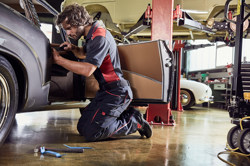 Der Bund ist dehnbar und lässt sich dank der breiten Schlaufen bequem mit Gürtel tragen. Werkzeuge finden in diversen aufgesetzten und verdeckten Taschen Platz, für Zollstock, Stifte und Handy sind ebenfalls praktische Einschubfächer vorgesehen. Der Clou: Weil z.B. ein Tischler oder Metallbauer das Werkstück keinesfalls mit Knöpfen oder Reißverschlüssen zerkratzen darf, wurden diese Teile alle verdeckt verarbeitet.